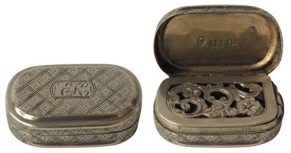 LOTTO 26 – Periodo GIORGIO III, di John Shaw, Birmingham, 1810-11. Di forma ovale (cm.3,2), decorata su ogni lato da un elegante motivo geometrico, al centro della parte superiore le lettere “ER” incise. Decorazioni floreali e girali decorano la griglia interna. Base d’asta euro 225. OFFRI IN TEMPO REALE.