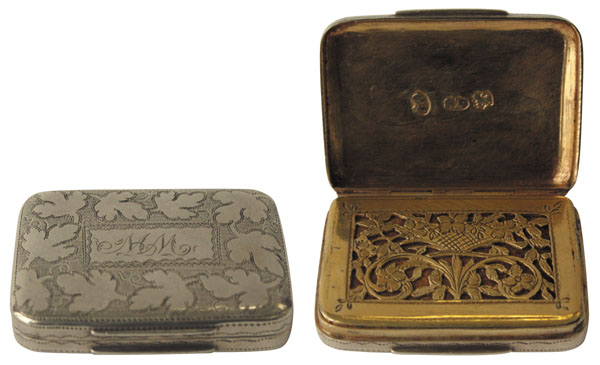 LOTTO 35 – Periodo GIORGIO III, di Samuel Pemberton, Birmingham, 1809-10. Elegante forma rettangolare (cm. 3,7) dagli angoli arrotondati, copertura e dorso decorati con motivo inciso di foglie, al centro le lettere “MM” incise. All’interno contenitore per sali, con la spugnetta d’epoca, con coperchio incernierato e splendidamente decorato con girali di fiori e foglie. Base d’asta euro 350. OFFRI IN TEMPO REALE.