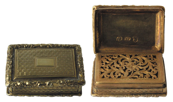 LOTTO 23 – Periodo GIORGIO IV, di John Bettridge, Birmingham, 1824-25. Di forma rettangolare (cm. 3,2) con i bordi decorati a rilievo, copertura e dorso ugualmente decorati. All’interno contenitore per sali con coperchio incernierato e traforato con girali di fiori. Base d’asta euro 225. OFFRI IN TEMPO REALE.
