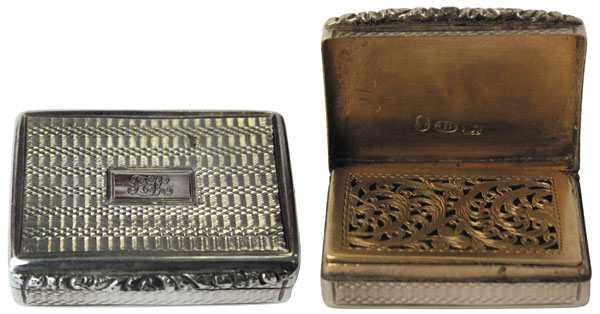 LOTTO 18 – Periodo GUGLIELMO IV, di Joseph Bettridge, Birmingham, 1830-31. Dalla forma rettangolare (cm. 3,6), con decorazioni uniformi su tutti i lati, al centro incise le lettere “EK”. Griglia interna minuziosamente decorata con motivi floreali e foglie. Base d’asta euro 250. OFFRI IN TEMPO REALE.