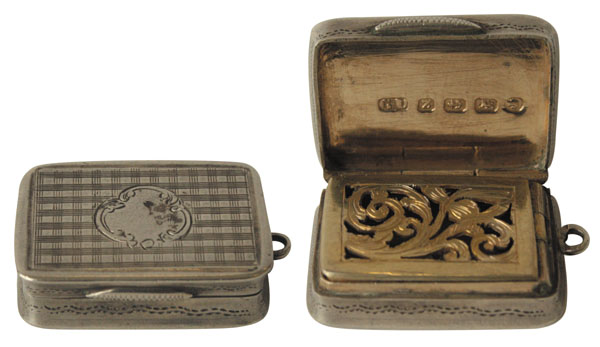 LOTTO 25 – Periodo Regina VITTORIA, di George Unite, Birmingham. Rettangolare (cm. 2,9), angoli smussati, lato superiore e dorso incisi con un decoro stile “tartan”, sulla copertura un medaglione dove poter incidere le iniziali del proprietario. Griglia interna incisa con decorazioni dalle forme sinuose. Base d’asta euro 225. OFFRI IN TEMPO REALE.