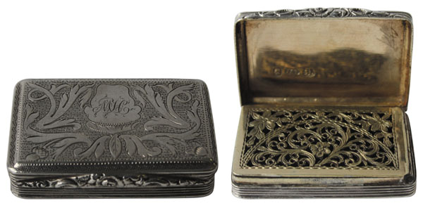 LOTTO 16 – Periodo GUGLIELMO IV, di Taylor & Perry, Birmingham, 1830-31. Di forma rettangolare (cm. 4,3), angoli smussati, parte superiore decorata con motivi floreali dalle linee morbide. Incise al centro le lettere “MH”. Dorso decorato con incisioni geometriche, foglie e fiori. La griglia interna e’ fittamente decorata con motivi floreali e linee arrotondate.Base d’asta euro 350. OFFRI IN TEMPO REALE.