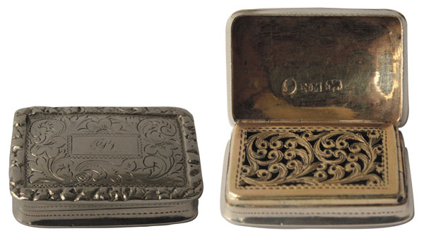 LOTTO 14 – Periodo Regina VITTORIA, di Nathaniel Mills, Birmingham, 1842-43. Graziosa forma rettangolare (cm. 3,6) con angoli smussati, bordi a rilievo cesellati e decorazioni floreali sulla parte superiore. Al centro una “P” incisa. Dorso decorato con incisioni geometriche, foglie e fiori. La griglia interna sapientemente decorata.